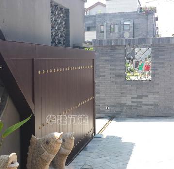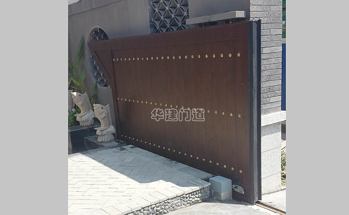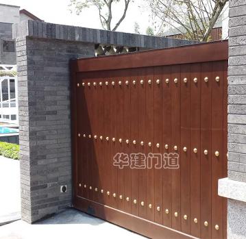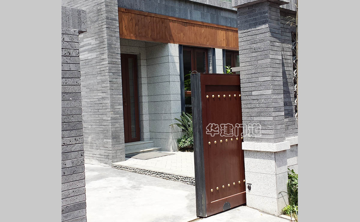 青城鑒山別墅項目采用我司高端實木遙控庭院門;門體采用鋼骨架,外覆實木木板,總厚140㎜;門體底部設承重輪,頂部設不銹鋼導向槽和溢流管(引流雨水);門體正反面均鋪設進口榿木木板,與圍墻重疊部分采用鋼材做懸挑支撐;門體木板采用凹凸楔口拼合,外不露釘,設有邊框和銅質炮釘;門體油漆采用進口室外環保油漆;驅動電機采用平移開門機,運行平均速度控制在10cm/s-20cm/s之間;停電可手動開關門,電動時可通過控制盒或遙控器作開、停、關操作;在門體前端設有雙氣囊結構的安全氣囊保護裝置,當門體運行過程中遇有障礙物阻擋將自動停止運行;門洞兩側設有紅外線保護裝置,在門體運行過程中有障礙物穿越,門體將自動停止運行;在實際使用中運行輕便自如,高雅美觀、宏偉大氣,得到客戶及用戶的一致好評!