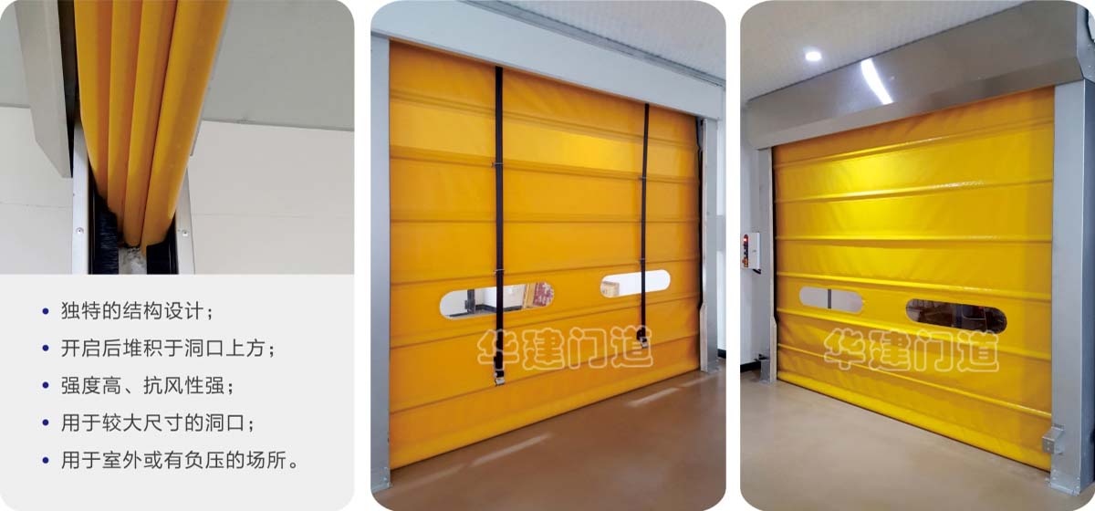 華建工業快速堆積門以轉軸旋轉門體特制背帶實現堆積方式啟閉,采用進口的高抗拉性能的工業基布,配備抗風圓管,強度高、抗風性強,配備高速專用開門機,通過智能控制及變頻裝置等實現高速的運行。運行速度達到0.6-2.0m/s,配置轉軸密封外罩,密封式軌道、安全氣囊、紅外線保護裝置等,實現了高速、安全、可靠、美觀、耐用的完美結合。被廣泛用于需要快速啟閉、隔斷空氣對流、縮短出入時間、需要節能環保等且正負風壓較大的特殊場所。