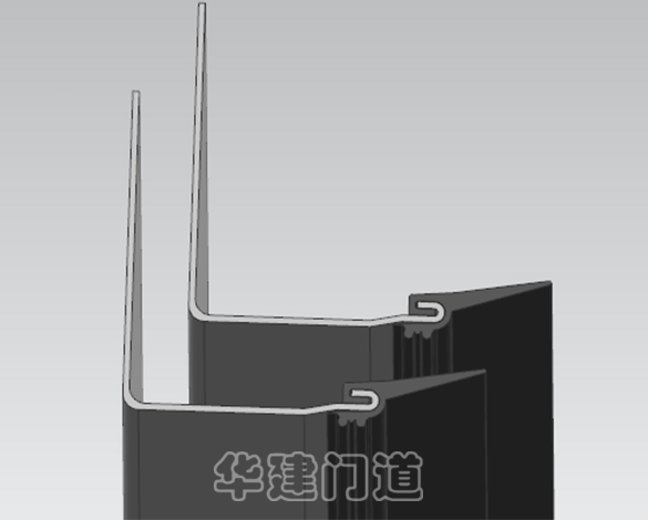 華建銅藝車庫門配備的軌道護軌及密封件(如圖),軌道護軌采用帶止退鉤造型,可防止車庫門安裝好后密封件被外力從軌道護軌上拉拽脫落。密封件采用三元乙丙橡膠材質,日曬雨淋均不變質老化、開裂。 | 市場中低質車庫門不配或配低端的軌道護軌及密封件,也有部分產品(如圖),軌道護軌為簡單的折角處理,無止退鉤,門安裝好后密封件可用外力從護軌上拽掉,密封件為劣質PVC材質,易變質老化、開裂。 | |
