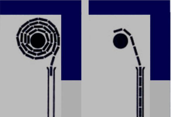 圖A:安裝普通支撐的工業歐卷門運行過程中與軌道的關系圖(剖面) | 圖B:安裝華建滾動支撐系統的工業歐卷門運行過程中與軌道的關系圖(剖面) |