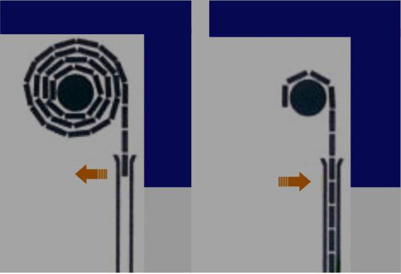 說明:通過圖中及對比顯示可看出:采用常規支撐端板的工業歐卷門(圖A)轉軸直徑大小會隨著門體開的高矮狀態而逐步變大,變小,轉軸的直徑是變化的而轉軸的位置是固定不變的 ,工業歐卷門的門體與軌道必定形成如圖中(圖A)顯示一樣的斜面和夾角,造成軌道與門體出現非常大的摩擦 ,故門易壞、摩擦力大、噪音大、密封性差等弊端;華建的主動滾動支撐系統(圖B)解決 了以上缺陷,實現了工業歐卷門的轉軸在門體開和關的過程中自由的前后移動,不管轉軸因為門體開或關的直徑變大還是變小門體永遠是垂直于軌道槽口(圖B),不會與軌道產生大的摩擦力,所以安裝華建的主動滾動支撐系統的工業歐卷門使用壽命會更長、運行噪音更小、故障率更低、抗風性能更好。