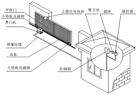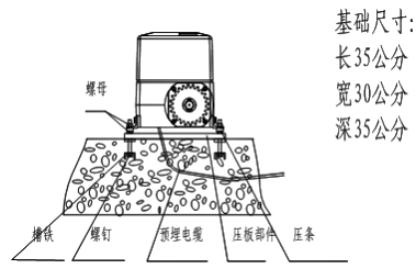 安裝前在地面預(yù)埋設(shè)輕軌軌道長(zhǎng)度為大門長(zhǎng)度的兩倍。門的軌道應(yīng)保證平直,在門的軌道兩端頭安裝機(jī)械限位塊。從電控箱所在地至主機(jī)附近需埋設(shè)電線管道。管道材料為硬鎧甲管、鍍鋅管或鋁塑復(fù)合管。管內(nèi)徑應(yīng)大于20mm。電機(jī)安裝需有牢固的基礎(chǔ),各部件安裝位置及電機(jī)基礎(chǔ)要求如圖: